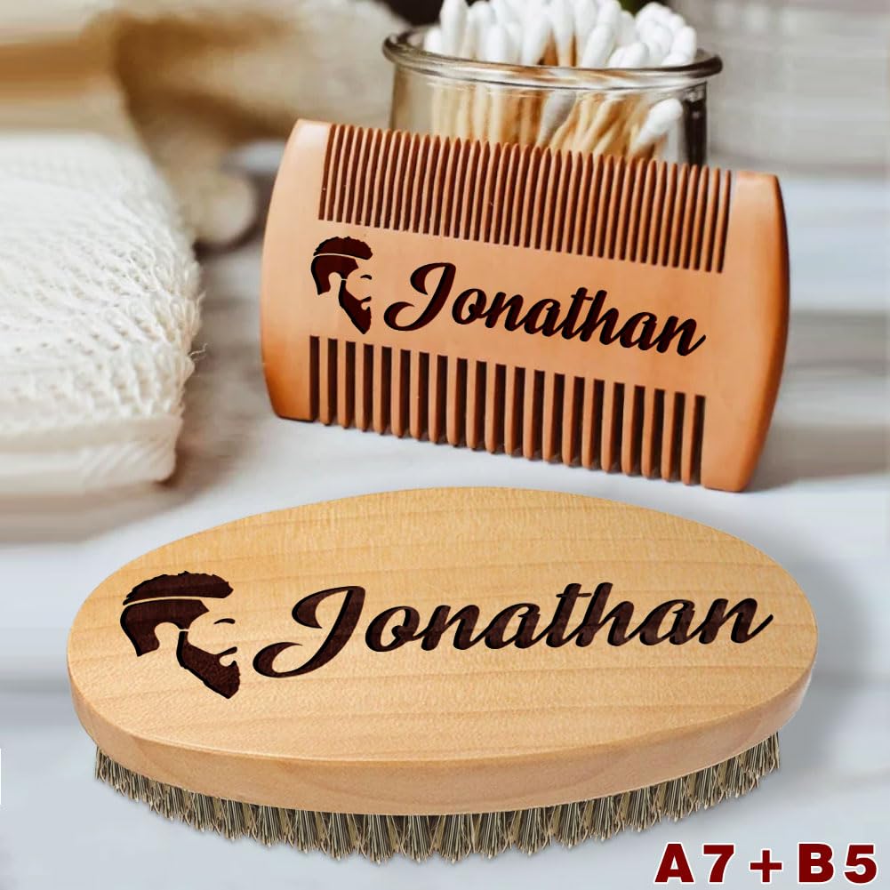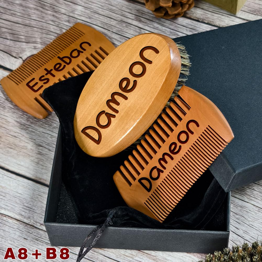 Personalized Name Beard Comb & Beard Brush Set for Men - Natural Boar Bristle Brush and Dual Action Pear Wood Comb w/Velvet Travel Pouch and Gift Box, Ideal for Grooming Beards and Mustache